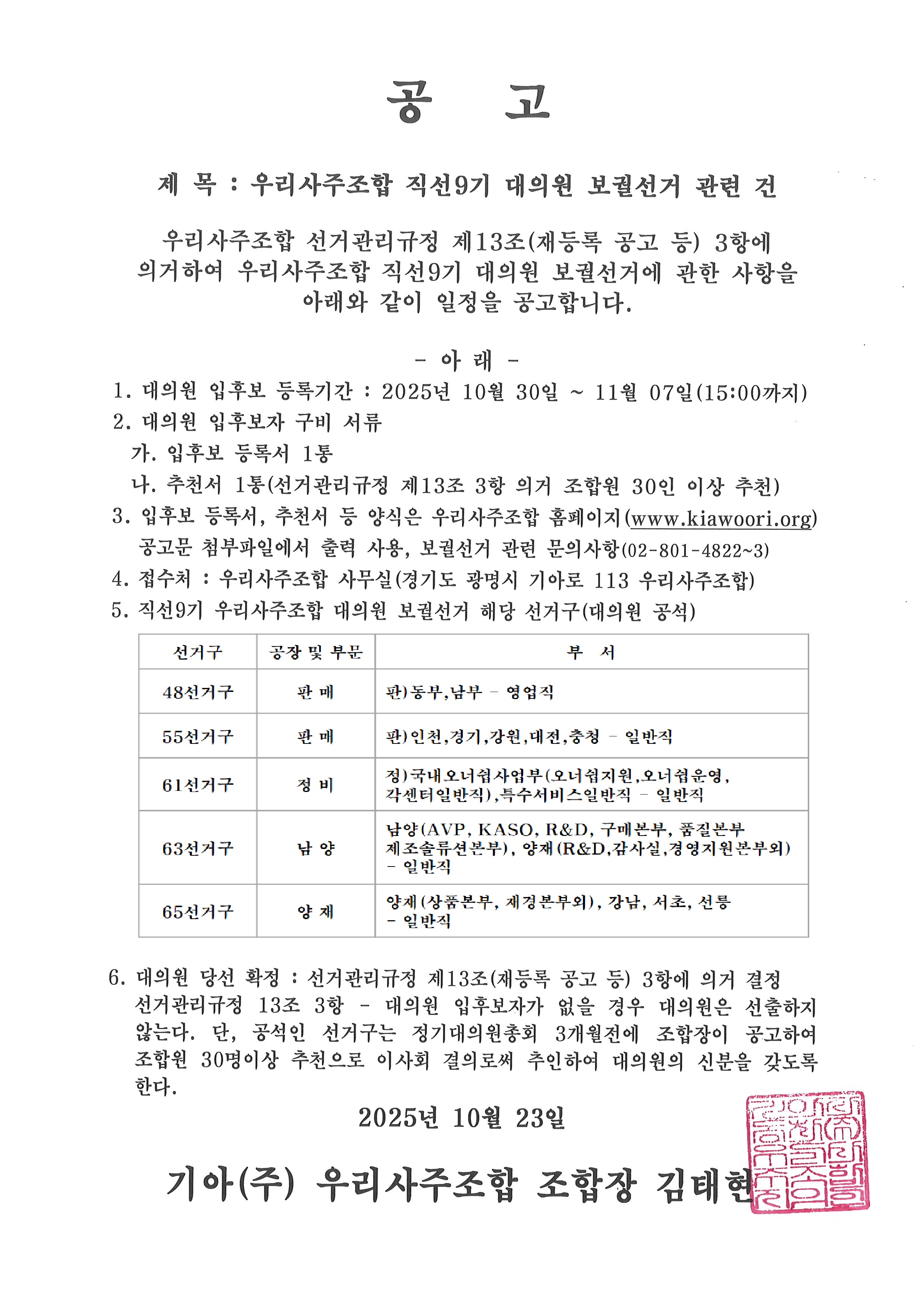 우리사주조합 직선9기 대의원 보궐선거 공고