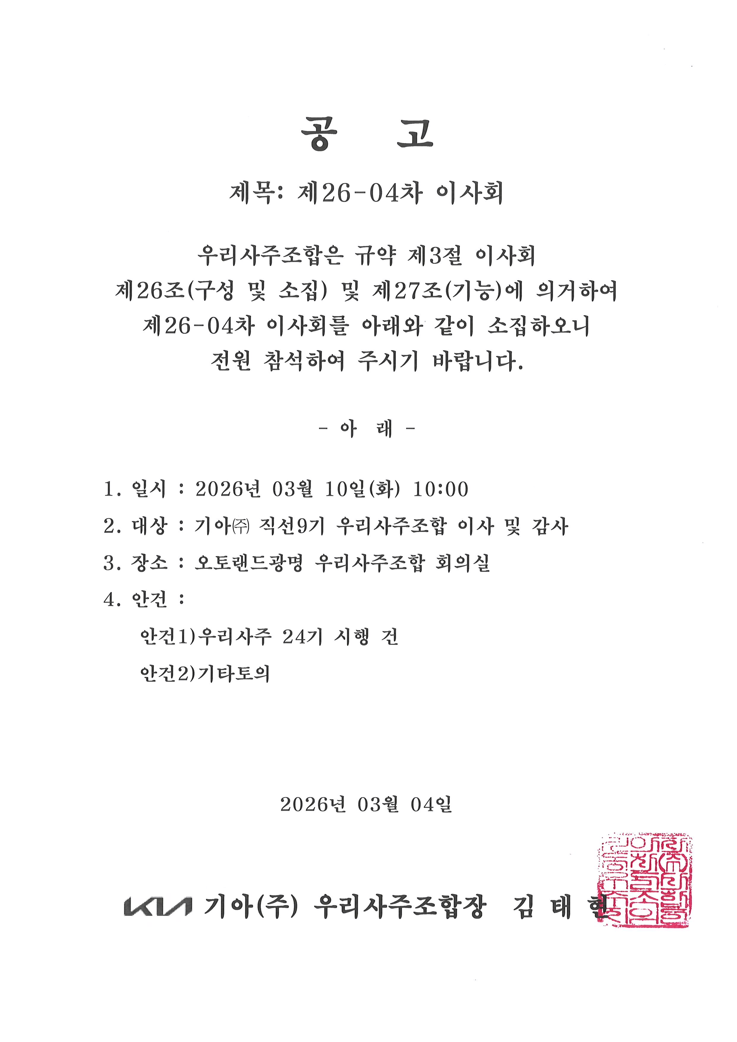 제26-04차 이사회 공고