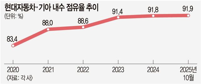 현대차·기아의 내수 점유율은 수년째 상승세다. 2020년 83.4%였던 점유율은 2021년 88.0%, 2022년 88.6%, 2023년 91.4%로 매년 올랐다. 지난해 91.8%에 이어 올 10월 기준 누적 91.9%를 기록하며 3년 연속 90%대 달성이 거의 확정됐다.