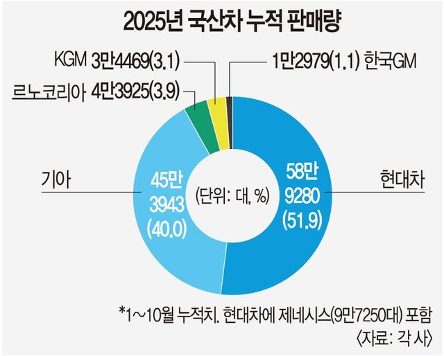 12일 업계에 따르면 올 1~10월 누적 기준 현대차(제네시스 포함)와 기아의 국산차 내수 점유율은 91.9%로 집계됐다. 같은 기간 현대차는 58만9280대(점유율 51.9%), 기아는 45만3943대(40.0%)를 판매했다. 반면 르노코리아는 4만3925대(3.9%), KG모빌리티(KGM)는 3만4469대(3.1%), 한국GM은 1만2979대(1.1%)에 그쳤다. 완성차 5개사 총판매량 113만4596대 가운데 현대차·기아가 10대 중 9대를 차지한 셈이다.