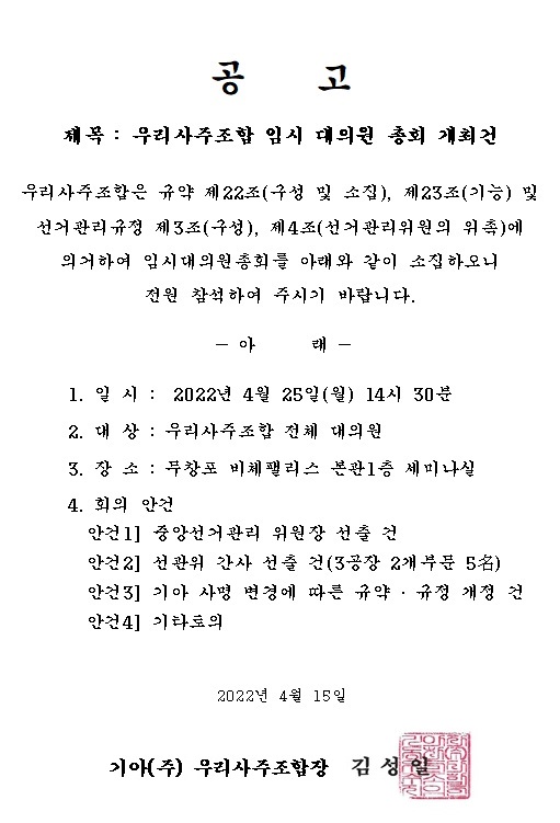 기아(주) 우리사주조합 임시대의원총회 공고문(22.4.25).jpg