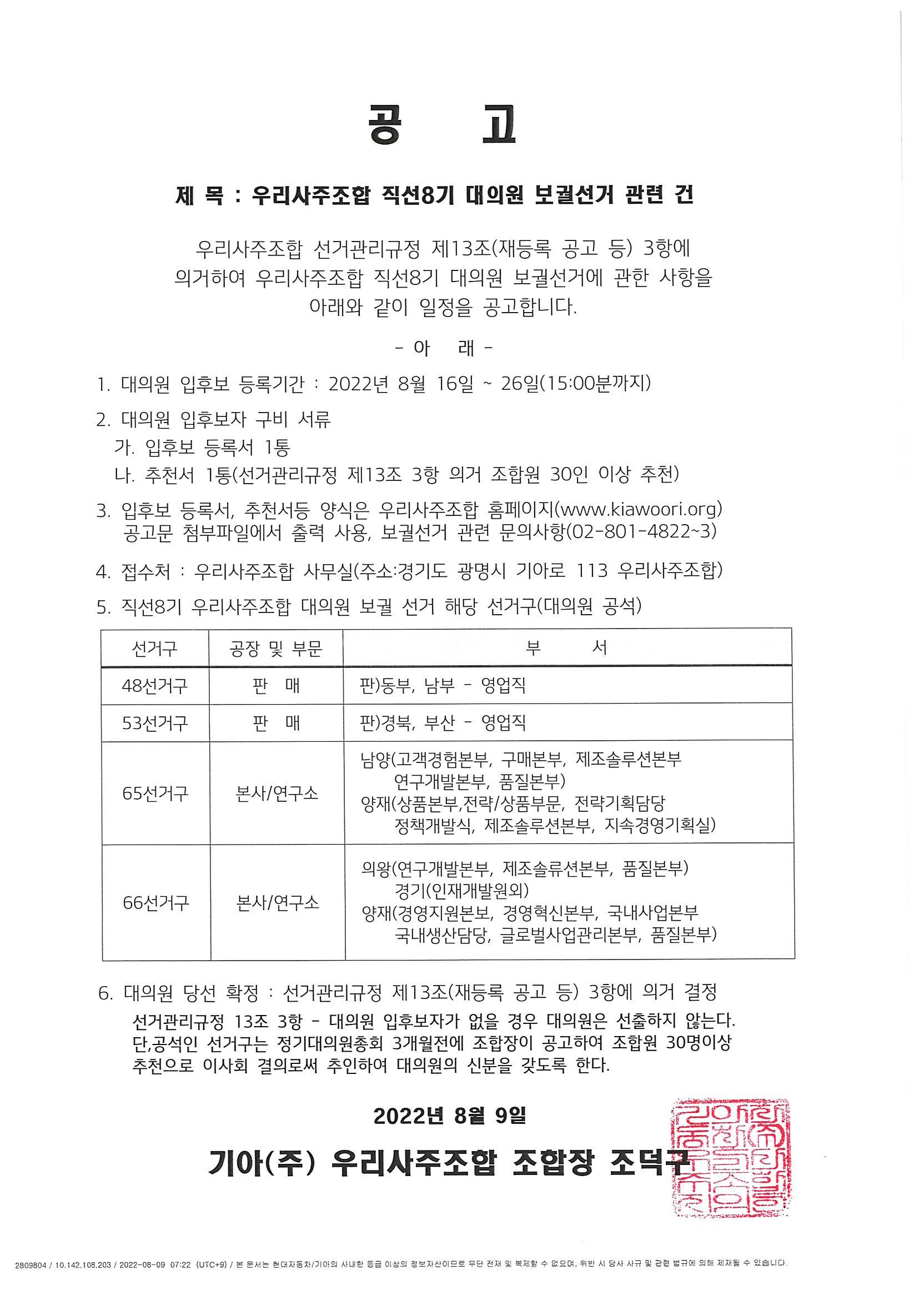 우리사주조합 직선8기 대의원 보궐선거 공고입니다.